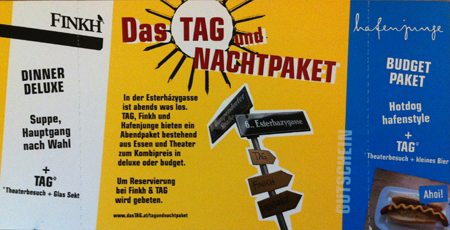Wer Theater nur mit Abendvorstellungen verbindet, der wird mit einer tollen Geschenk-Idee des TAG verblüffen können. TAG-und-Nacht heißt der Gutschein des Theater an der Gumpendorferstraße, der in zwei Varianten erstanden werden kann. All jene, die immer unter Zeitdruck stehen, freuen sich garantiert über eine Theaterkarte in Kombination mit einem Hot-Dog im Lokal Hafenjunge. Ein Bierchen im TAG selbst, vor der Vorstellung, in der Pause oder danach, gehört auch noch dazu.