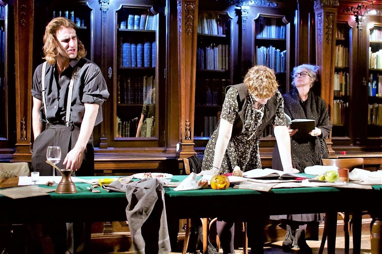 Krassnigg und Luka Vlatkovic schlüpfen in unterschiedliche Rollen und begleiten Nina C. Gabriel als „Anica“ durch ihre dramatische Familiengeschichte. Auf dem Holztisch, der die Bibliothek der Länge nach beinahe zur Gänze ausfüllt, sind alte Fotoalben ausgebreitet. Schnaps, Schwarzbrot, Äpfel und Kletzen (getrocknete Birnen) laden zu einem gemütlichen, familiären Beisammensein ein.
