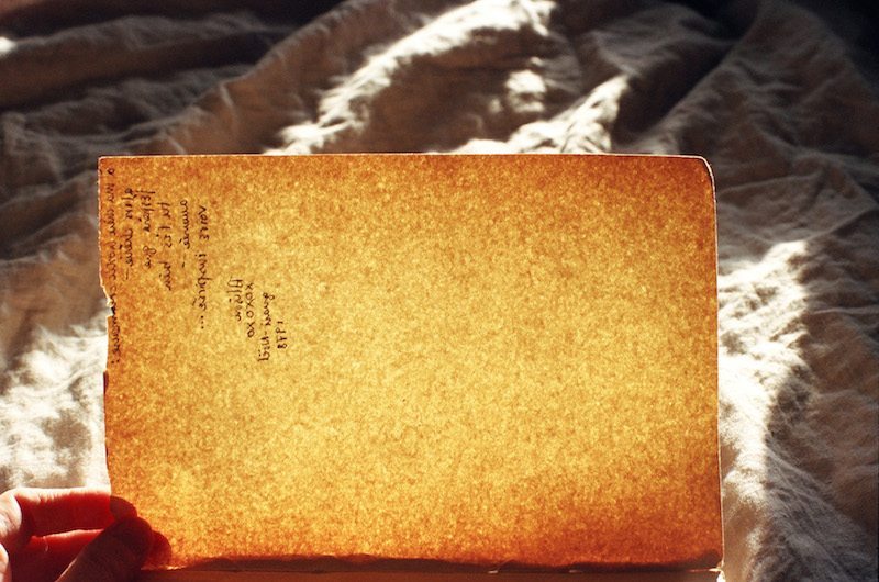 Eingebettet in das Büchlein sind neben den beiden Texten auch einige Fotos jener Ausstellungsstücke, die im Mumok zu sehen sind. Eine abermalige Überlagerung des ursprünglichen Ausgansproduktes also. Das Ausgangsprodukt, zählt man einmal die Überlegungen über Genet zu diesem Kunstprojekt nicht dazu, das Ausgangsprodukt sind Fotos von Moyra Davey und zwar unterschiedlichster Art. Ablichtungen von einem Stapel mit Notizen, die mit gelben Papiermarkern versehen sind, der Ausschnitt eines Bettes mit zerknülltem weißem Betttuch, auf dem Bücher mit selbst gemachten, bunt bemalten Einbänden liegen. Filmstills, aber auch ein ätherisch schönes Bild eines grünen, verwitterten Holzzaunes – dem ein braunes Blatt Papier gegenübergestellt wird. So wird Ästhetisches mit Gedanklichem zu einem neuen Ganzen verwoben, ergibt eine so dichte, so vielfältige Sammlung, dass die Interpretation derselben nicht anders als individuell ausfallen kann.