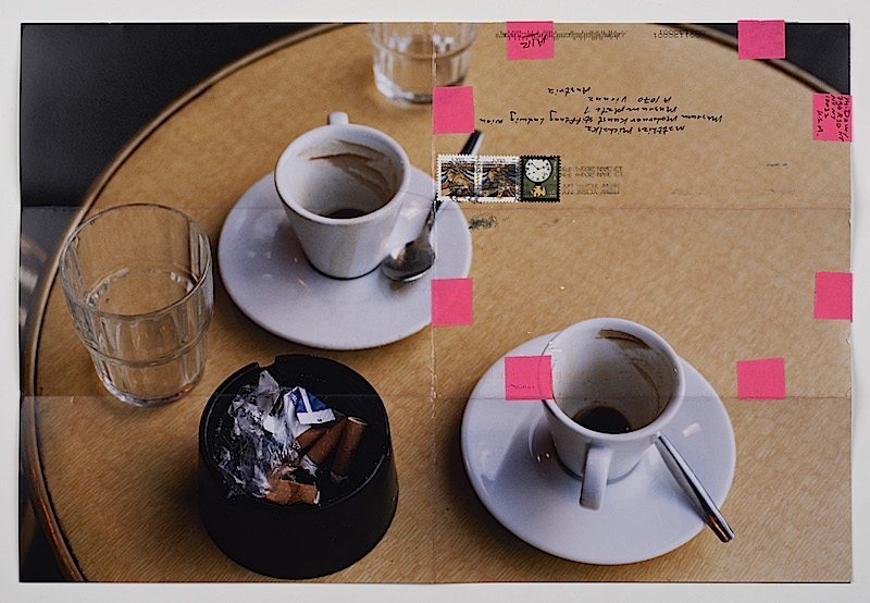 An den Wänden der Ausstellung selbst sind die Fotos der Künstlerin gerahmt hinter Glas zu einzelnen Gruppen geordnet. Sie weisen allesamt Falzungen auf und kleine, meist bunte Klebepapierstreifen. Außerdem sind sie mit Adressen und oft auch mit Briefmarken versehen. Davey hat die Fotos, oft feine, ganz intime Stillleben, nicht selten mit Genet-Bezügen, in einer ganz bestimmten, ihr eigenen Art gefaltet und sie per Post an ihre Freunde, einen Teil aber auch direkt ans Mumok geschickt. Dann zurückerbeten und in der Ausstellung wieder entfaltet und mit all den bis dahin entstandenen Gebrauchsspuren arrangiert. Die zeitliche Dokumentation, die damit einhergeht, erinnert dabei stark an das Werk On Kawaras, wenngleich Daveys Zugang ein viel persönlicherer ist. Sind es bei On Kawara zum Beispiel industriell gefertigte Postkarten, die er verschickte, so schafft Moyra Davey ihren von eigener Hand gefertigten postalischen Kosmos.
