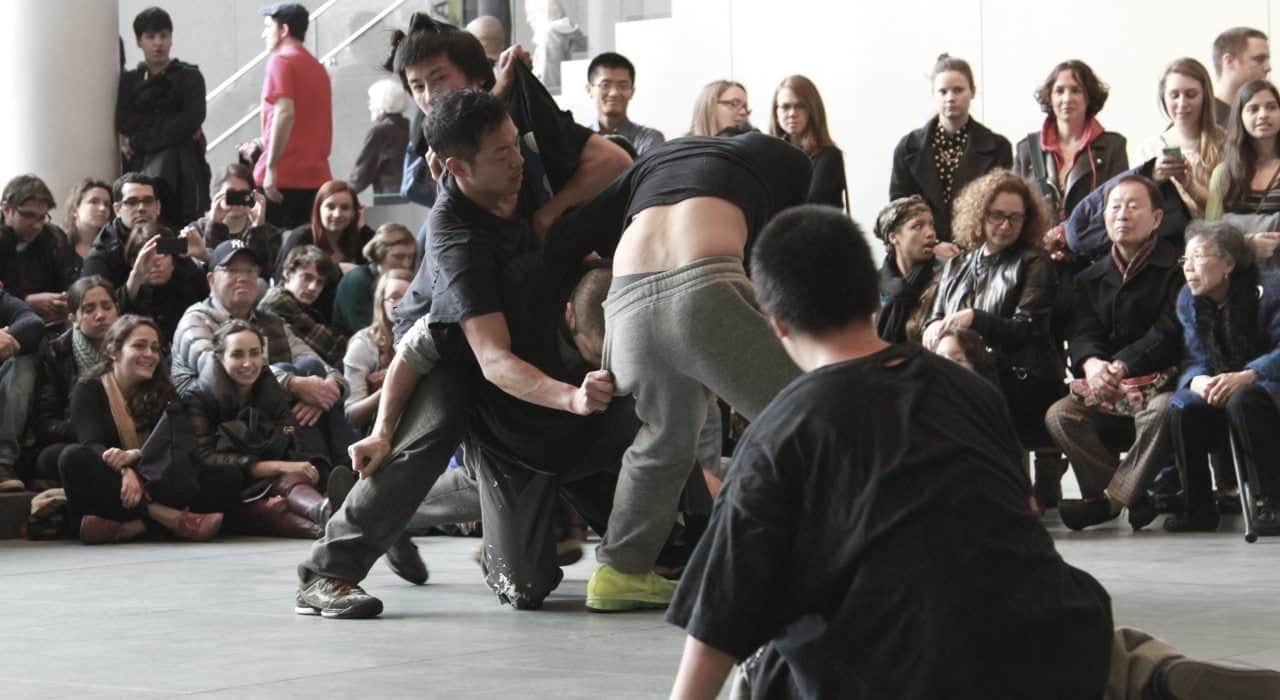 Weil alles so simpel aussieht, haben sich die Mitglieder der Gruppe eine linguistische Verteidigungsstrategie zusammengebastelt, nämlich eine „philosophy of pain“. Näher geht Tsukahara darauf nicht ein, aber Schmerz ist tatsächlich eines der Hauptelemente, treffen die Schläge die Männer doch gänzlich ungeschützt, fallen sie doch nicht auf weiche Bodenmatten, sondern lediglich auf eine nichtrutschende Plastikunterlage, die auf dem steinernen Museumsboden liegt. Entwickelt hat sich die Bewegung bei Zusammentreffen im Park. Sie kann von allen ausgeübt werden, Regeln gibt es keine, bis auf die Ausnahme, dass nicht mit den Füssen getreten werden darf.