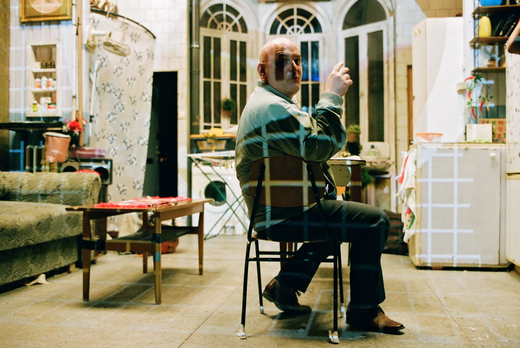 Márton Ágh ist für das hervorragende Bühnenbild verantwortlich, das in allen Phasen des Stückes überzeugt. Das durch die Drehung entstandene Chaos und die Unordnung ist eine anschauliche Metapher auf unruhige, chaotische Zeiten, in denen sich für viele das Leben auf den Kopf stellt und es keine festen Bezugspunkte mehr gibt. Rasch wird klar, dass die Makler und Vermieter immer Opfer finden, die dringend eine Wohnung benötigen, so wie die junge Frau Veronika Fenyvesi. Mihály Sudár trifft als Makler und Geldeintreiber auf diese alleinerziehende Mutter, die in einer On-Off-Beziehung lebt und Opfer von häuslicher Gewalt ist. Wie in vielen Fällen, ist es ihr jedoch nicht möglich, sich von ihrem gewalttätigen Freund zu trennen. Der Regisseur arbeitet mit der Einspielung von SMS-Meldungen, an denen man die Gewaltspirale und die Aussichtslosigkeit des Flüchten-Wollens von Fenyvesi nachvollziehen kann. Dass die junge Alleinerzieherin Schwierigkeiten hat, ihren Sohn ausreichend zu ernähren, erklärt einen Teil ihrer Abhängigkeit.