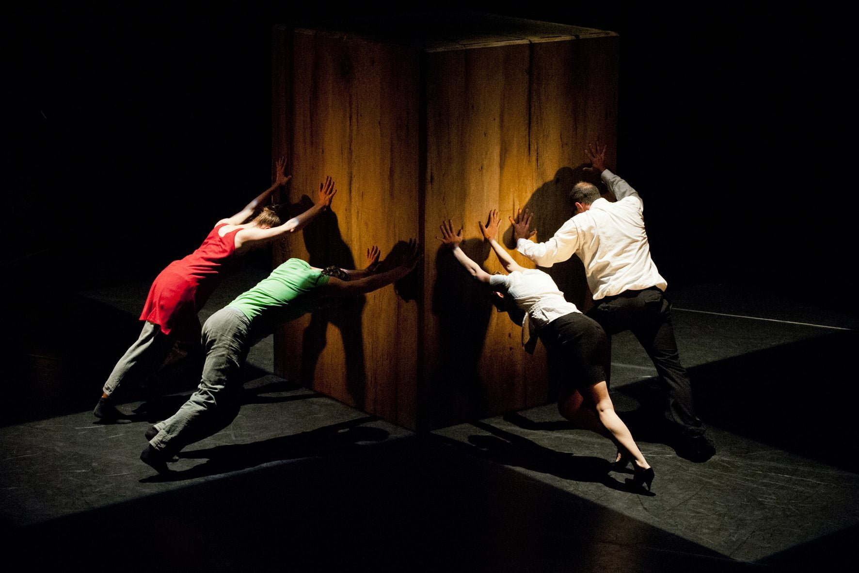 Dabei gab es eine massive Schwierigkeit zu überwinden: Einen großen, übermannshohen Holzquader, der mitten auf der Bühne schon kurz nach Beginn für Irritationen sorgte. „Bounce! Spring!“ waren bald jene Aufforderungen, mit denen die beiden Männer und Frauen aus Frankreich das Monstrum vergeblich zu überwinden versuchten.