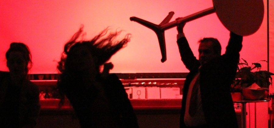 Zwei Männer (Junod und Schwanda) und zwei Frauen (Weber und Staduan) breiten in diesem Stück die ganze Palette an Zuständen aus, die Menschen derzeit befällt, wenn sie sich mit Politik beschäftigen oder diese sogar ausüben. So werden dabei pseudo-demokratische Versammlungen simuliert, in welchen die Phrasendreschereien fröhliche Urstände feiern. Es werden soziale Missstände angeprangert, um im selben Atemzug die Ausreden parat zu haben, die rechtfertigen, warum man dagegen doch nicht angehen kann. Es kommt zu euphorischen Zusammenrottungen, in welchen jeder und jede sich gegenseitig bestärkt „jetzt aber“ etwas zu verändern, jedoch vor lauter Euphorie, außer dem Lippenbekenntnis des Aufbruchs, nichts übrig bleibt. Junod beleuchtet auch eine typisch wienerische Auseinandersetzung mit dem Thema Politik. Darin spielt Martin Schwanda einen Maggiflascherl haltenden Besserwisser, der beim Schlürfen seiner Suppe in breitestem Wiener Jargon die typischen Parolen eines Stammtischpolitikers von sich schleudert. Dabei beginnt er sich so in Rage zu reden, dass die junge Wirtin – Petra Staduan, genervt, weil sie von ihrem Handydisplay aufschauen muss – ihn mit „gib a Ruah und iss dei Suppn!“ zur Raison rufen muss. Herrlich, wie Doina Weber dabei langsam im Hintergrund als betrunkene Lokalbesucherin von ihrem Barstuhl rutscht und zeitweilig, wie ein Affe, unter dem Tresen hängen bleibt. Aber nicht nur die Befindlichkeit des Wahlvolkes wird unter die Lupe genommen. In einer fiktiven Parteisitzung erhält man tiefe Einblicke, warum Veränderungen ganz schlecht bewertet werden, bergen sie doch immer die große Gefahr, Rückwirkungen auf die eigene einzementierte Machtposition zu haben. Und so bleibt jene Frage, welche die Sitzung eröffnen sollte „Jemand eine Idee?“ eine rein rhetorische. Das an diese Szene anschließende Zeitungsballett, bei welchem die vier SchauspielerInnen nebeneinander auf Barhockern aufgefädelt, gleichzeitig eine chinesische Zeitung umblättern, und beim Anblick diverser Artikel in ein- und dieselben gestischen Äußerungen wie Erstaunen, Ärger, oder ungehemmtes Lachen verfallen – ohne auch nur ein Wort dabei zu sprechen – hat nicht nur Erheiterungswert, sondern birgt auch eine große Portion Erkenntnismöglichkeit. Zu sehen, wie sehr die Leserinnen und Leser beim gleichen Artikelstudium ein und demselben Gefühlsschema folgen, macht überdeutlich, wie manipulativ die Medien eingesetzt werden können, wenn man nur auf der richtigen Klaviatur zu spielen weiß. Neben der geballten Portion politischer Verbalerotik geht es schließlich aber auch zur Sache. Nach einem Hasscrescendo, in welchem deutlich wird, dass es jetzt genug sei, fliegen die Barhocker und türmen sich schließlich mit allerlei anderen Requisiten zu einem Revolutionswall auf. Der anschließende Trauergesang danach macht deutlich, dass der politische Ausbruchsversuch, die Auflehnung, die in gewalttätigen Aktionen endete, mit Opfern zu beklagen war. Was für das Establishment bleibt, ist aber immer noch die Bedrohung der Werwölfe, jenes Wahlvolkes, das wehmütig wütend wird über die wässrigen Wahlversprechen, bei denen sie nur Wischi-Waschi-Worte erhalten und danach die Wahl als Witz apostrophieren wollen. Junods postdemokratisch dunkelste Vision ist jedoch jener Abgesang, der die musikalische Bezeichnung Coda trägt. Da erinnern sich die Alten an Zeiten, in denen sie noch Träume hatten. Gebrechlich im Seniorenheim vereint, bleibt ihnen aber nichts als diese Erinnerung, die durch die Melodie einer kleinen Spieldose begleitet wird. Es ist die „Internationale“, die zu hören ist. Von ganz weit weg scheint sie noch ins Jetzt zu wehen, verstümmelt, kaum erkennbar, ein Relikt aus einer Zeit, in der ein Klassenkampf noch Sinn zu machen schien.