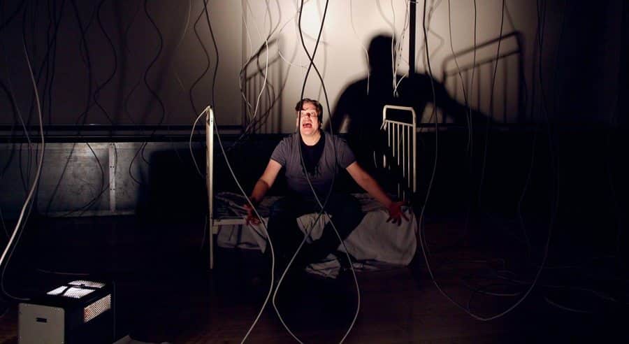 Eine ausgesucht schöne Stimme vom Band rezitiert aus der Offenbarung des Johannes. Erzählt vom Untergang der Welt mit all seinen Gräueln und Monstern, die einst den Planeten beherrschen werden. Im Hintergrund dazu spinnt ein zarter Choral seine sakralen Fäden. Im weißen, metallenen Gitterbett liegt ein junger Mann. Graue Jogginghose, ein Feinrippleibchen, darüber ein offenes, elegantes Smokinghemd – nackte Füße. Nichts deutet darauf hin, dass dieser Mann Hamlet, der Prinz von Dänemark ist. Oder seine späte Reinkarnation, oder eine imaginäre Gehirnfestsetzung, die Besitz ergriffen hat von einem, der sich nun in einer prekären Situation befindet. Im Irrenhaus. „Der Rest ist Schweigen“ – mit diesen Worten, den letzten aus Shakespeares Drama endet die Passage aus der Apokalypse, die Johannes so wort- und bildreich beschrieben hat. Und zugleich beginnt damit ein Parforceritt durch die Gedanken Hamlets alias Florian Lebek – jenem Autoren-Schauspieler, der waghalsig seine eigene Hamletidee auf die Bühne brachte.
